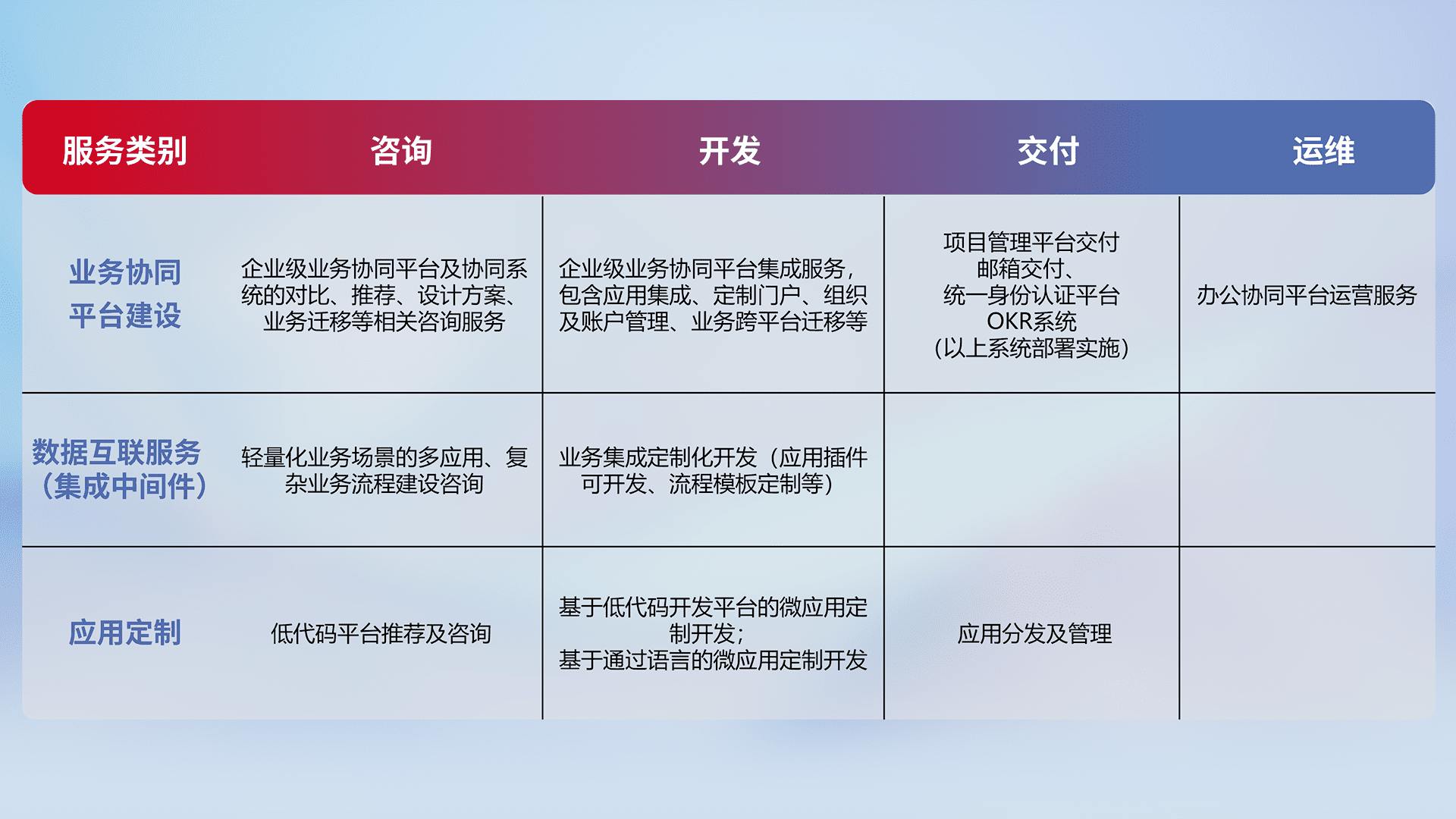 针对钉钉、、、企微、、、、IDaas等平台级产品提供产品的规划、、、、方案、、交付、、、、定制化开发等服务,,,实现如统一协同办公、、智能客户服务、、混合会议管理、、、智能数据查询、、、、等业务场景,,,实现数字化转型。。
